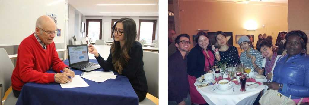 - durch ein monatliches Treffen der Sprachpaten, um Fragen, Probleme und Erfolge bei der Unterstützung der Studierenden in ungezwungener Atmosphäre zu besprechen;